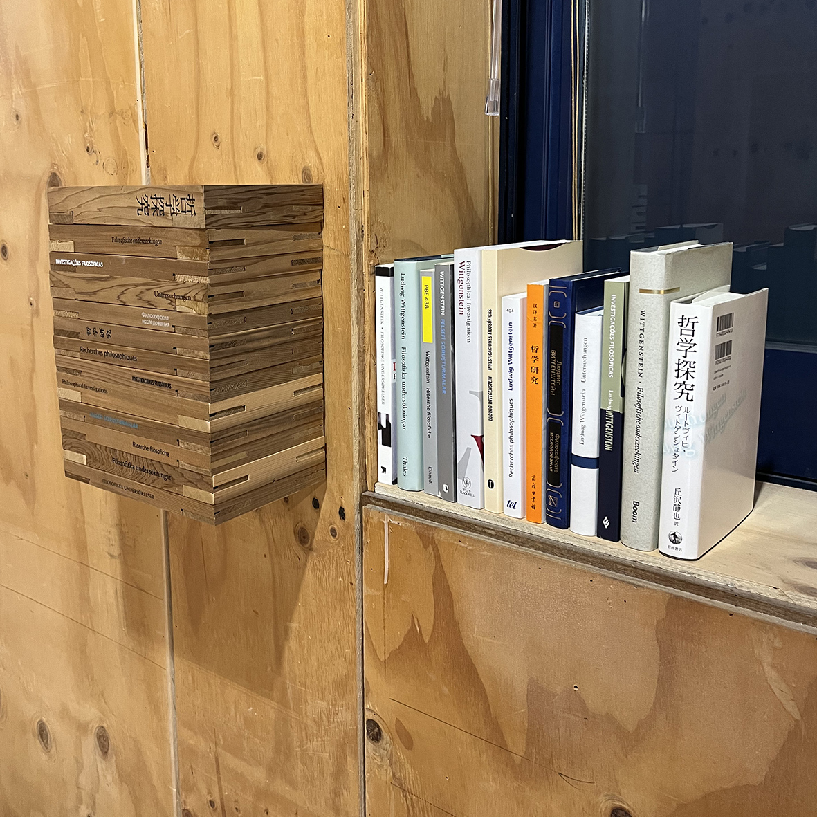 하나의 책이 각기 다른 언어로 번역된 책들과 그 책의 제목이 프린트된 캔버스 틀들.