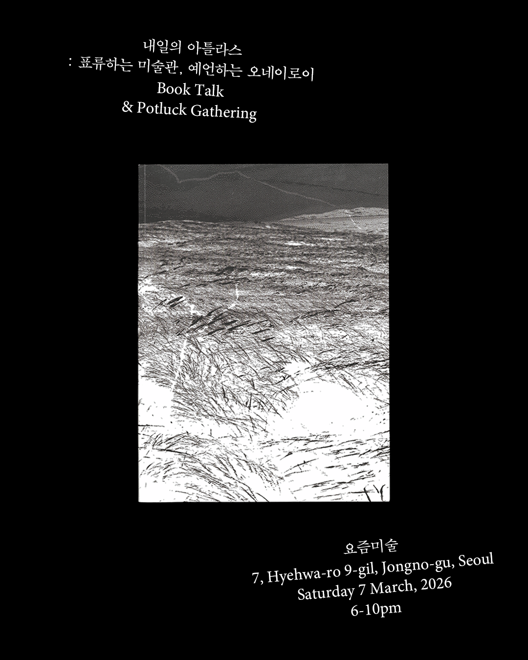 『내일의 아틀라스』는 동시대 한국 미술계의 진입을 초입에 앞둔 젊은 미술 작업자들이 작업을 위한 자신의 언어를 강화하고, 미학적 판단의 근거를 마련하여 예술적 감응의 지평을 열어가는 협업형 출판 프로젝트입니다. 픽션과 도큐먼트를 프로젝트의 미술 어법으로서 활용하며, 동시대 미술의 주요 거대 담론 리서치를 통해 관점 에세이를 작성합니다. 협업을 거쳐 작성된 텍스트는 다른 장과의 교차적 협업으로 확장되며, 장에 대한 각주, 이미지 목차, 관점 수집의 형태로 프로젝트 속 다중의 연결망을 생성합니다. 『내일의 아틀라스』는 서로 다른 시공간에서 발화된 언어가 겹쳐진 출판물이며, 텍스트에 기반한 하나의 전시적 공간이자, 독자가 재조립하며 읽어가는 표류하는 미술관이 되길 기대합니다.