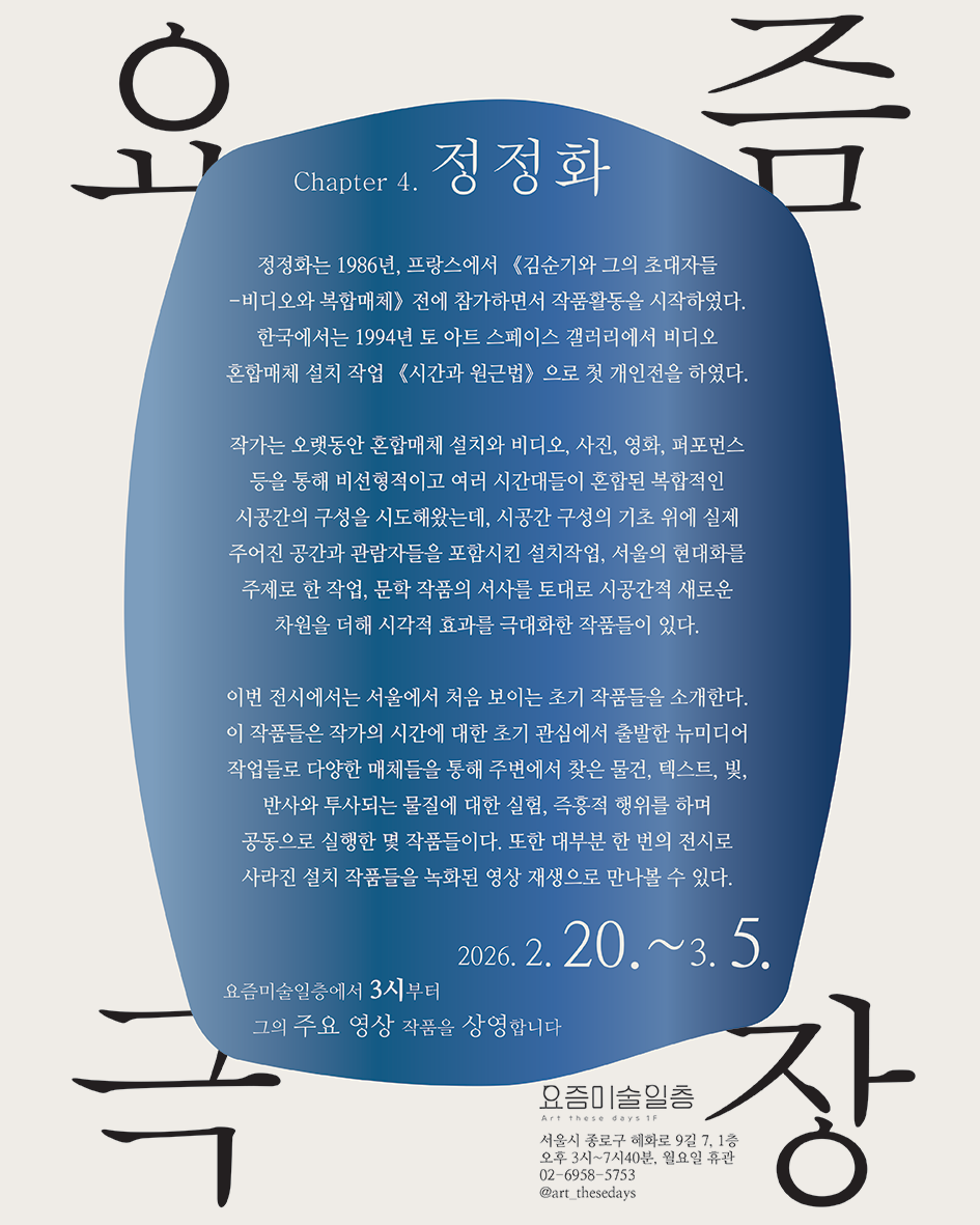 ‘요즘극장’은 20년 이상, 시간을 동력으로 예술 활동을 하고 있는, 한 작가의 거의 ‘모든’ 작업들이 움직이고 있는 극장입니다. 이 극장에서는 작가 스스로 작업을 선별하고 순서를 정해 구성된 이야기를 볼 수 있습니다. 또한 미공개 작품이나 사적인 기록들까지 특별함이 수군대는 극장입니다. 상영시간을 잘 확인하세요. 하루 중 아주 잠깐, 혹은 종일 상영할지도 모릅니다.