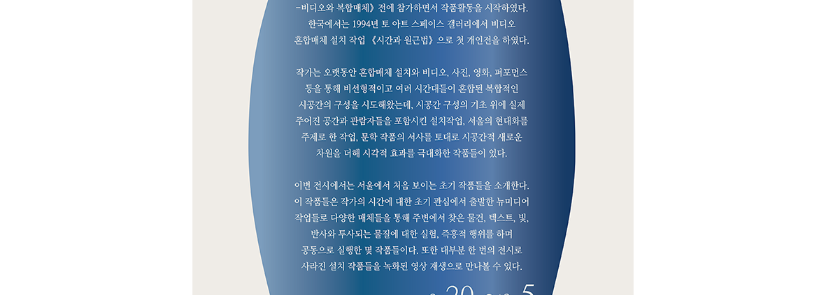 이번 전시에서는 서울에서 처음 보이는 초기 작품들을 소개한다. 이 작품들은 작가의 시간에 대한 초기 관심에서 출발한 뉴미디어 작업들로 다양한 매체들을 통해 주변에서 찾은 물건, 텍스트, 빛, 반사와 투사되는 물질에 대한 실험, 즉흥적 행위를 하며 공동으로 실행한 몇 작품들이다. 또한 대부분 한 번의 전시로 사라진 설치 작품들을 녹화된 영상 재생으로 만나볼 수 있다.