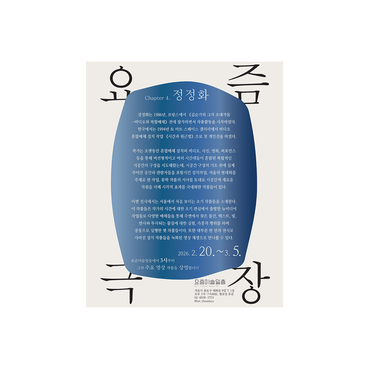 ‘요즘극장’은 20년 이상, 시간을 동력으로 예술 활동을 하고 있는, 한 작가의 거의 ‘모든’ 작업들이 움직이고 있는 극장입니다. 이 극장에서는 작가 스스로 작업을 선별하고 순서를 정해 구성된 이야기를 볼 수 있습니다. 또한 미공개 작품이나 사적인 기록들까지 특별함이 수군대는 극장입니다. 상영시간을 잘 확인하세요. 하루 중 아주 잠깐, 혹은 종일 상영할지도 모릅니다.
