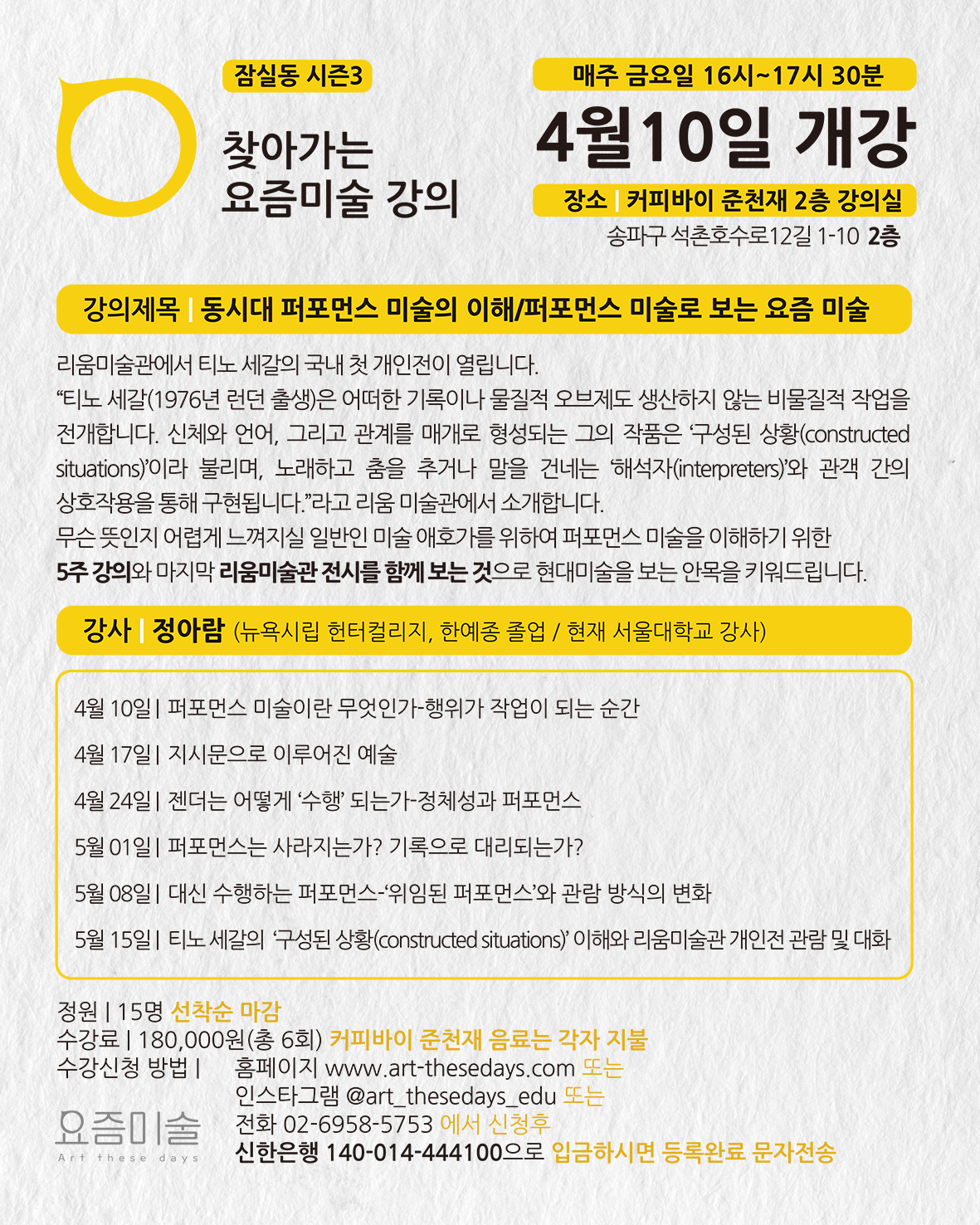잠실동 미술애호가들을 위하여 ‘찾아가는 요즘미술강의’가 돌아옵니다. 이번에는 리움미술관에서 열리는 티노 세갈의 전시를 보기위한 5주의 현대 퍼포먼스 미술 강의를 하고, 6주차에 강사와 같이 전시를 보고 대화를 하는 현장 교육을 준비하였습니다. 많은 관심과 호응 바랍니다.